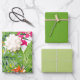 Three sheet wrapping paper set. Sheet 1 is a tropical green leaves design with bright pink and orange flowers . Sheets 2 and 3 are coordinating solid green sheets. Contact us for help with customization or to request matching or coordinating products.
