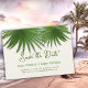 Save the date wedding announcements in green and white. Palm fronds design on white paper. Customize three text templates in shades of green that match the realistic tropical leaves at the top of the paper. Modern script and printed fonts are used.