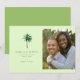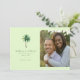 This wedding save the date features a split layout with a light green background on one side, showcasing a detailed illustration of a palm tree. The other side includes a warm, soft-focus photo placeholder of two individuals embracing, suggesting an intimate moment. The design employs classic serif fonts for a refined touch and uses a muted color palette to create a tropical yet elegant theme. Perfect for conveying warmth and joy, this template is ideal for couples celebrating their union in a serene setting.