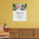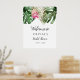 Modern bridal shower welcome sign featuring watercolor illustration of monstera leaves, palm leaf, and pink king protea flower. Perfect for your summer party.