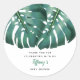 Elegant tropical theme baby shower sticker featuring illustration of green monstera leaves. The message says "thank you for celebrating with us." This foliage design in green is great for a gender neutral shower in the summer.