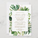 Celebration of Life, Funeral Memorial card design. It features watercolour tropical leaves and faux gold leaves frames, on a white background; on the back greenery frame on green background. Use Personalise tool to add your info. For matching items, please, visit my In Loving Memory Collection.