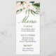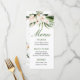 Tropical theme menu card features a watercolor motif of greenery and soft pink exotic flowers. Perfect for an elegant beach, destination or luau themed wedding or bridal shower. Available in a variety of sizes. Customize the wording in your choice of fonts and colors.