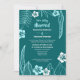 Classy, sophisticated, modern design featuring text framed by drawn tropical leaves and hibiscus flowers in tones of turquoise, teal blue and white. A great choice for couples who are looking for something modern and stylish and ideal for destination beach style weddings.