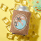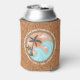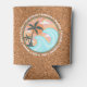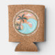Simple classic beachy looking beverage can cooler with fun colorful retro Illustration image of green palm trees, blue waves, orange sun, and yellow and pink sunrays. Surrounded by words related to summertime... Waves, Beach Parties, Good Vibes, Cocktails, Summer, Friends, Laughter, Sun, and Surf. Cool cups for use during bbq beach or backyard parties and to have in stock at your patio or poolside tiki bar.