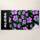 Aloha Hawaiian island message beach towels with a tropical floral hibiscus pattern in purple and green and the Hawaiian word Aloha printed in island style lettering. Use these beach towels while on vacation or for your summer trips to the beach.