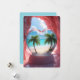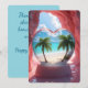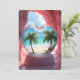 A heart-shaped glass encases a tropical beach scene with two palm trees, depicting a serene seaside view. Warm pink hues surround the glass, adding a dreamy atmosphere to the composition.