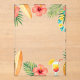 Vibrant tropical border frame bursting with watercolor hibiscus flowers in bright coral pink and sunny yellow, lush green palm leaves, juicy pineapple slices, classic surfboard, flaming tiki torch, refreshing pineapple cocktail with umbrella and straw, colorful lei garland, and fresh citrus accents.