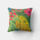 With this colorful and lovely throw pillow, you may add color and a special touch to your home. Tropical palm foliage, hibiscus and heliconia flowers are featured in the pattern.