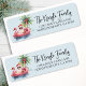 Tropical Santa Christmas Return Address Label. This festive return address label features a relaxed Santa Claus lounging in a pink flamingo floaty, surrounded by tropical holiday details like a palm tree decorated with ornaments, gentle ocean waves, and a small island in the background. The charming watercolor artwork appears on the left, while your name and address are on the right in black fonts for a clean, bold look. The background is a soft light blue, like water, adding a cheerful coastal vibe. Perfect for adding a bit of surf and sand to your Christmas cards, Christmas in July invitations, or holiday party mailings—ideal for tropical locales or anyone who loves a beachy holiday style.