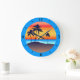 Clock in an image of a tropical island with palm trees, against an orange sunset and turquoise ocean, with turquoise border