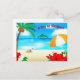 Spend a day at the beach with this tropical island beach getaway postcard! White sand, green palm trees, tropical flowers, coconuts and shade umbrellas. Can you picture a more relaxing paradise island to stay at?