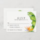 Watercolor tropical island botanical leaves and bird of paradise florals, wedding RSVP card. Personalize text font style, color, and size.