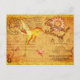 A vintage postcard featuring a hummingbird and a swordfish and says tropical island. Has an aged , yellowed look.