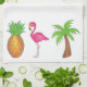 Features an original marker illustration of a pineapple, palm tree, and tropical pink flamingo! Great for an island getaway.