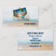 A tropical island postcard scene with spilling ocean water, starfish, and beach sand in an envelope on a whitewashed wood background for a travel agent.