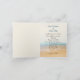 A blank invitation paper with an envelope rests on a sandy beach against the backdrop of gently swaying palm trees and a serene ocean under a vibrant sunset for a beach wedding invite.