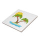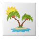 A beautiful beachy scene consisting of a couple of palm trees, the water and a bright shiny yellow sun.