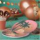 The mouth-watering colors of a summer fruit salad, from melon and peach through apricot and raspberry, give the pieces in this matching wedding design set some of it's irresistible appeal... the beautiful island palm trees, palm fronds, delicate birds in the sky and giant sunrise over sparkling water easily provide the rest. The paper plates shown here feature all of the above plus a template to easily add the couple's names and wedding date. Search ID581 to see the matching products and other color options for this design.