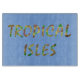 Mosaic, graphic text, "Tropical Isles" which signifies, a fictitious, fantasy place-displayed in an exotic, island pattern of; orange, olive-green, yellow, taupe, brown, black, and white.