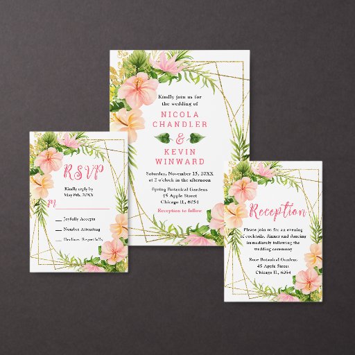 This beautiful and elegant wedding accommodations card can be customized with important information for your guests such as hotel and lodging reservations or recommendations. The design features watercolor pink and orange hibiscus flowers and foliage. The text combines handwritten script and serif fonts for a stylish and modern look. This is perfect for a summer tropical wedding.