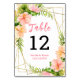 This beautiful and elegant wedding table number sign features watercolor pink and orange hibiscus flowers and foliage on a gold geometric frame. The text combines handwritten script and serif fonts for a stylish and modern look. This is perfect for a summer tropical wedding.