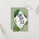 Modern and informal wedding Save The Date card featuring a beautiful illustration of green tropical jungle leaves. Easily add your ceremony date and the bride and groom's names in dark grey fonts over a geometrical white shape background.