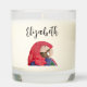 Topical jungle parrot scented candle, with a colorful macaw drawing and customizable script lettering. A fun addition to your home decor.