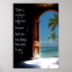 This poster features a surreal photo image of a dreamy Caribbean beach, glimpsed through a weathered doorway and the words of wisdom, "There is no key to happiness... because that door has always been open to you".