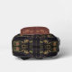 Old world European, exotic and dark, with a slight flavor of the Orient, the beautiful pattern by ZoeSPEAK, in natural colors on this Backpack, was made from Zoe’s original photograph of wrought iron latticework and tropical print fabric. Palm fronds and other tropical leaves, in shades of pale greens, terracotta and beige, rest gracefully on a black background behind the latticework. The design is in the style of a clutch bag or purse, with a floral medallion button closure on a dark background, smooth fabric flap over a faded burgundy textured fabric of the same pattern. The flap is edged with a salmon pink grosgrain ribbon.