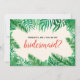 Modern bridesmaid proposal card featuring beautiful watercolor tropical leaves framing the text "[Name], will you be my bridesmaid" in a matching combo of modern sans serif and brush calligraphy script. Cards reverse to a text placeholder for your message in the back.