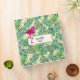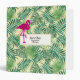 A personalized binder with a green tropical leaves pattern and a white frame with a gold border layered over top. A pink flamingo illustration adds a touch of whimsy.