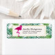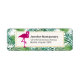 Address labels with a green tropical leaves pattern and a white frame with a gold border layered over top. A pink flamingo illustration adds a touch of whimsy.