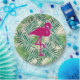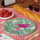Paper plates with a green tropical leaves pattern and a pink flamingo illustration layered over top which adds a touch of whimsy.