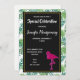 A party invitation with a green tropical leaves pattern and a black frame with a gold border layered over top. A pink flamingo illustration adds a touch of whimsy.