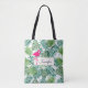 A personalized tote bag with a green tropical leaves pattern and a white frame with a gold border layered over top. A pink flamingo illustration adds a touch of whimsy