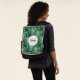 Personalized backpack with your name and initial inside a white circle. Background is a pattern of exotic tropical philodendron leaves in green. Hand painted digital image. A hint of pink in the background.