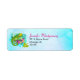 Return address labels with a cute illustration of a green tropical lizard surrounded by leaves and flowers on a turquoise blue color.