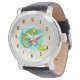 A watch with a cute illustration of a green tropical lizard surrounded by leaves and flowers on a turquoise blue color.