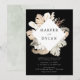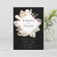 Elegant, modern tropical wedding invitations featuring your wedding names surrounded by a square frame of watercolor flowers and tropical foliage in earthy shades of white, tan, beige, rust, brown, sage, and dark green. Personalize the invitation by adding your wedding details below in white text against a black background. The tropical wedding invitations reverse to a sage green watercolor background.