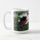 Start your day with a splash of nature’s brilliance. This ceramic mug features a stunning illustration of a tropical bird perched gracefully on a tree branch, surrounded by lush green foliage and misty forested hills