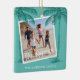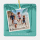 Tropical christmas ornaments featuring a teal background, 2 photos for you to replace with your own, silhouette beach palm trees, the hawaiian seasons greetings 'Mele Kalikimaka', and your family name.