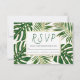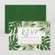 Tropical leaves green and gold wedding RSVP response card. This modern design features leaves of Split Leaf Philodendron (Monstera deliciosa) or Swiss Cheese Plant and palm leaves in green with gold outline. A white frame holds your text. The back includes a gold polka dot pattern on dark green. It is perfect for your tropical beach wedding, coastal wedding or destination wedding.