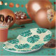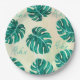 Big palm Hawaiian tropical leaves and aloha handwriting style script over a watercolor washed cream ivory background decorative paper plates for your summer beach parties.