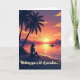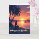 This greeting card shows a tropical sunset scene where warm oranges and pinks melt into deep twilight blues, creating a soft, romantic calm ❤️. A silhouetted woman sits on the sandy shoreline, her relaxed posture and slightly tilted profile suggesting she’s quietly thinking of someone dear. On the left, two tall palm trees rise in dark silhouette, their curved fronds leaning inward as if sheltering the moment. In the center, a golden sun hangs low and throws a shimmering path of light across still water toward faint, layered mountains tinted purple and orange. A small boat rests in the middle distance, adding a gentle sense of companionship in the wide, open space 🌼. A short line of text sits near the top in light lettering against the darker sky, with a smaller line placed near the bottom in a matching pale color above the sand. A few birds sweep across the upper sky in a loose formation, and a thin wave curls along the shoreline with a bright edge where it catches the sun.