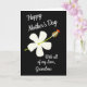 This card features a five-petaled tropical flower in bright white set against a deep, inky black background, creating a dramatic contrast that feels intimate ❤️. At the center, a fresh green pistil rises with tiny yellow tips and a small red accent, like a secret shared between close friends. Soft, direct lighting adds gentle shadows along the petals, giving the bloom a smooth, sculpted look. A flowing cursive-style greeting sits above the flower in white, standing out clearly against the dark backdrop. Below the blossom, a shorter sign-off appears in the same white lettering, aligned neatly to balance the layout. A slim green stem connects the flower to the lower space, guiding the eye from the text down into the bloom’s warm center 🌼. The white petals curl outward with subtle highlights, framing the green core with yellow details and a pinpoint of red.