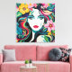 This abstract vibrant striking design captures the essence of a tropical goddess, blending bold floral elements with vivid, colorful waves of hair. The mesmerizing gaze and rich, saturated colors create a dreamy, lively composition that emits warmth and energy. Perfect for lovers of vibrant pop art and botanical beauty.