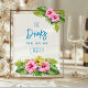 Opaque acrylic bar sign for a tropical themed wedding reception. Pink hibiscus flowers and big leaves decorate this 8x10 inch sign with sea blue text. Buy with a wooden holder, or not.