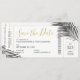 Tropical palm tree leaves (fronds) on a simple, modern, and minimal design boarding pass plane ticket save the date card perfect for a beach wedding or tropical island destination wedding with a chic retro-modern black and white with gold color theme aesthetic. All text can be personalized, as well as the text and background color. Click CUSTOMIZE FURTHER to do this in the advanced editor.