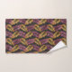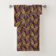 This bathroom towel set features a pattern of pink and gold tropical palm leaf fronds on a black background.